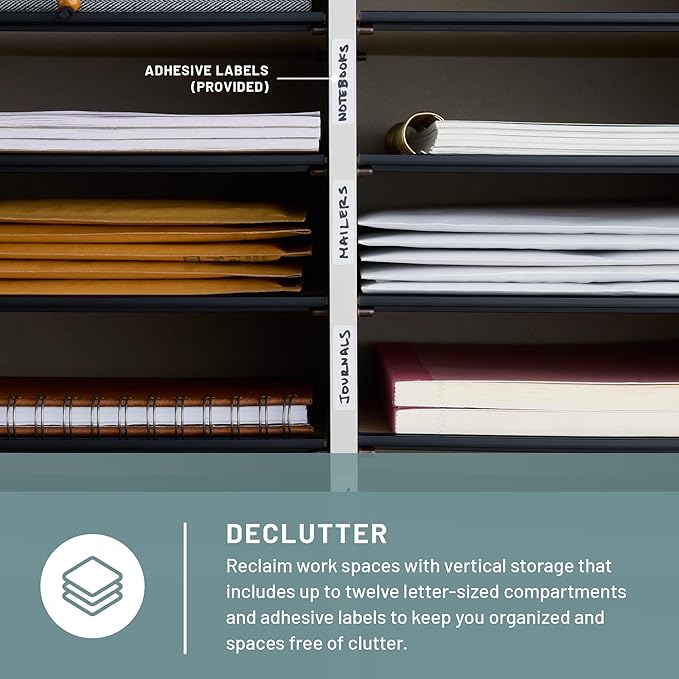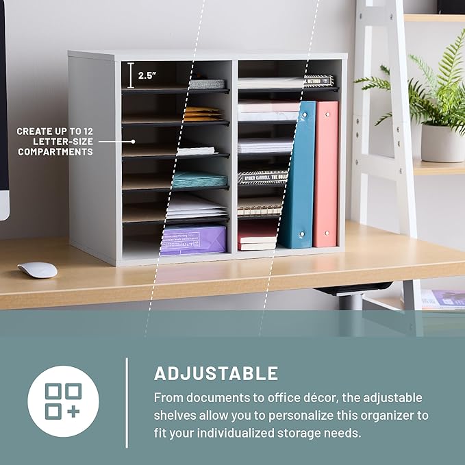- Customizable Storage: Create the organization you need with the flexibility you want.With 10 hardboard shelves included, you can configure 12 letter-size compartments (21/2"H x 9"W x 11 3/4"D) or various-sized slots to accommodate taller, larger items orcreate stacking storage areas. Adjustable in 2 1/2"increments.