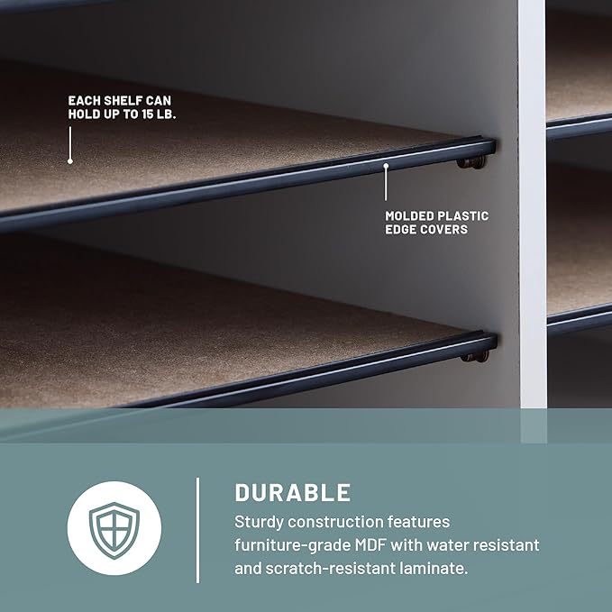 - Reliable Construction: Our wood file organizer is constructed of 5/8" furniture-grade,CARB compliant MDF with a laminate finish for a worry-free, long-lasting surface thatis water resistant, scratch-resistant, and easy to clean. Solid fiberboardback keepsitems from slipping through while providing strength and stability for long-lastingperformance. Includes 10 adjustable hardboard shelves with a molded plastic edge.Shelf can hold up to 15 lb. capacity. Labeling system included
