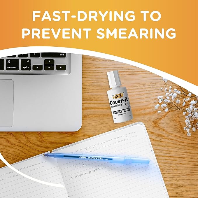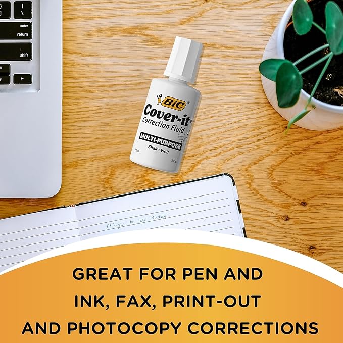 - Multi-purpose fluid corrects ink, faxes, copies, etc.