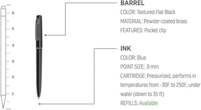 - PRESSURIZED CARTRIDGE: All-Weather cartridge is manufactured in the USA. The pressurized ink writes in temperatures from -30F to 250F, under water (up to 35 ft), and any angle.