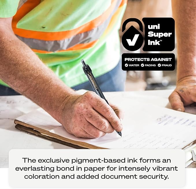 - Refillable biro pens have uni Super Ink that protects against water, fading and fraud.