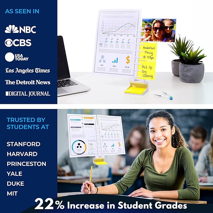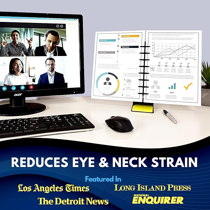 - Reduces Eye & Neck Strain: Strategically designed to position documents at eye level, this document holder for desk helps in reducing eye and neck strain associated with prolonged computer work. By displaying multiple documents, notes, and photos in an ergonomic position, it minimizes the need for repetitive head movement and refocusing of the eyes when looking from the screen to the document and back