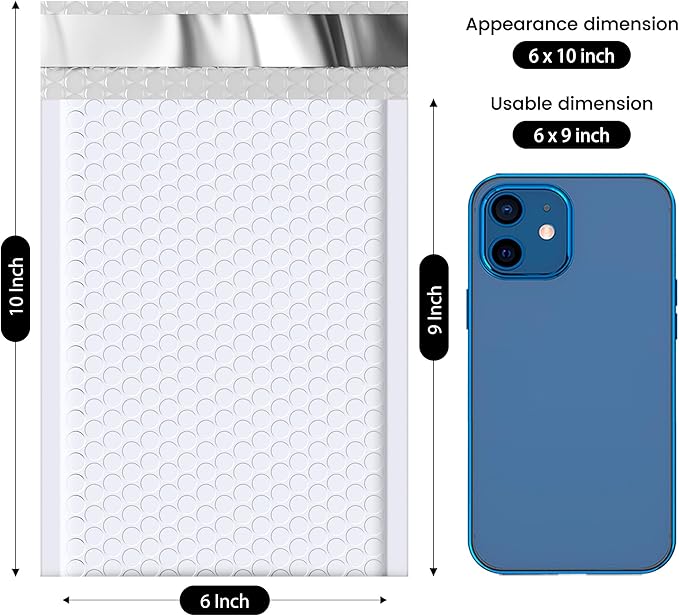 - 【Perfect Size Package Bags】The bubble envelopes outer size is 6x10 inch, while the inner size is 6x9 inch.Perfect for Jewelry, cards, CDs, Phone Cases, lips, smaller books and more and more.