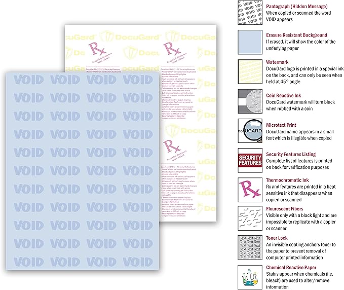 - The ultimate fraud fighter - DocuGard’s premier blue security paper has ten layered features ensuring that your prescriptions and documents cannot be tampered with or accurately duplicated.