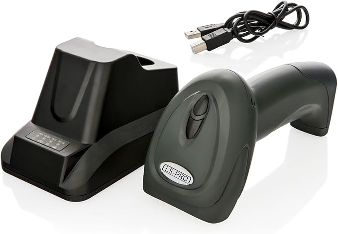 Wireless Barcode Scanner with USB Cradle Receiver Charging Base, 2.4GHz Handheld 1D Cordless Laser Barcode Reader, UP to 150Ft Transmission Range, long-life Battery 2200mAh, 1 Year Warranty.