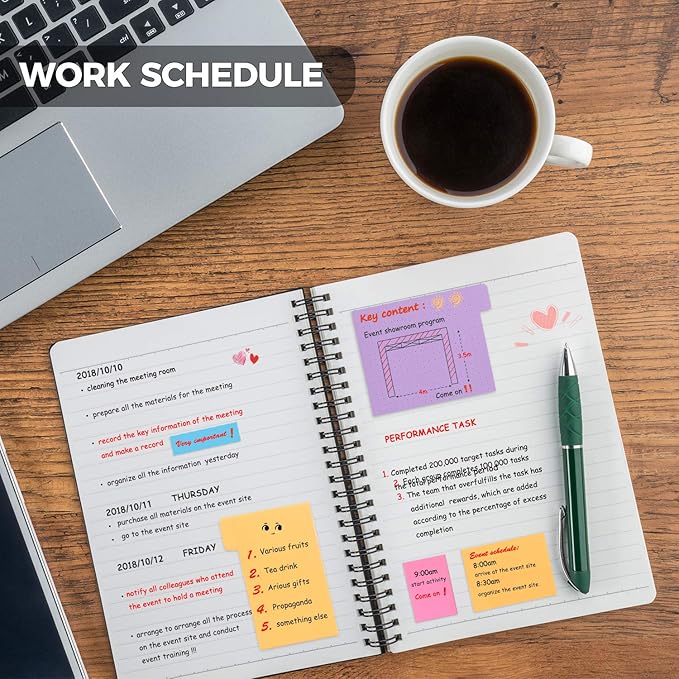 - Get Everything Organized - From color coding your documents to bookmarking important pages, these sticky notes will get you organized. The paper of notepad is sturdy, ink does not bleed through, portable and super handy to set goals. Removable adhesive for easy re-positioning, you can take them off without ripping the paper.