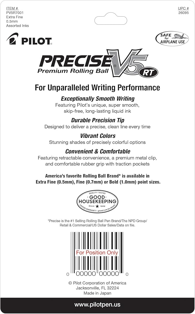 Pilot, Precise V5 RT Refillable & Retractable Liquid Ink Rolling Ball Pens, Extra Fine Point (0.5 mm) Assorted Ink Colors, Pack of 7