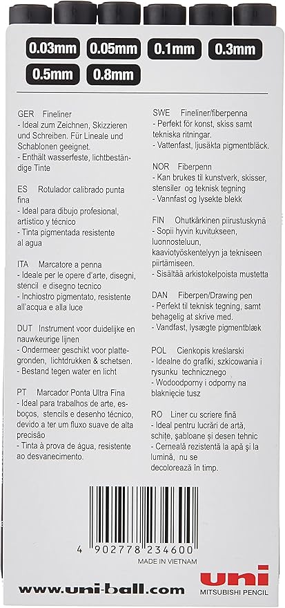 - Uni Pin Fineliner Drawing Pen - Sketching Set - Black Ink - 0.03 to 0.8mm - Set of 6