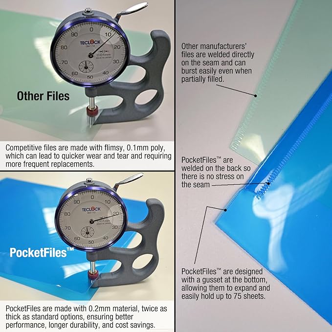 - KEEP YOUR DOCUMENTS PROTECTED - Made from durable .2mm thick polypropylene, PocketFiles will protect your files from spills and debris. Each PocketFile holds up to 75 sheets.