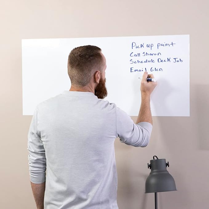 - QUICK-BUILD DRY ERASE BOARD - Self adhesive strong glue works perfectly on flat, non-texture, dustless, dry surface. First you need to clean the surface before applying. Just simply peel and stick, using squeegee or credit cards to slowly squeeze out the air. Peel off the protective film on the whiteboard surface, then you can start writing on it. Quick and easy, no hassle using dry erase paint which takes huge amount of time of work.