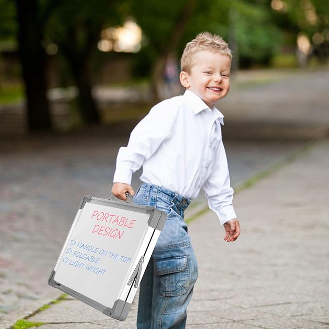 - STURDY AND PORTABLE - Double sided stand up small tabletop magnet dry erase whiteboard easel with solidly built but light weight. It is portable with a handle on the top for travelling.