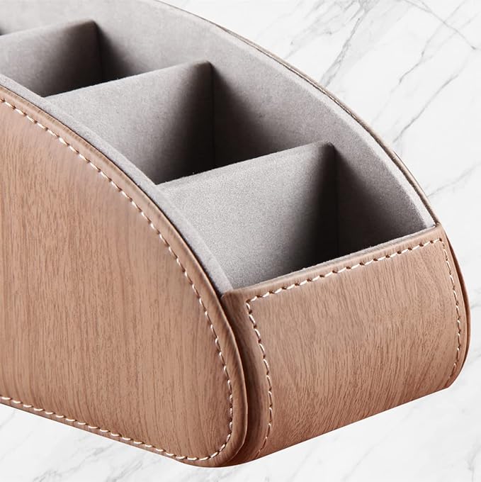 All-in-One Leather TV Remote Control Holder with 5 Compartments Nightstand Desktop Air Conditioner Media Player Remote Caddy Storage Box Organizer Tray For Makeup Brush Pen Stationary Table Controller