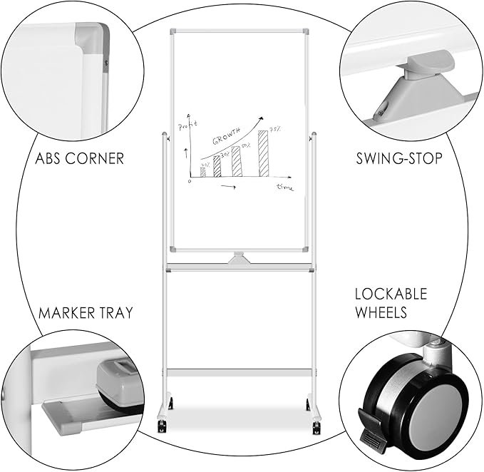 - Height Adjust 360° Rolling Double Sided Dry Erase Magnetic White Board