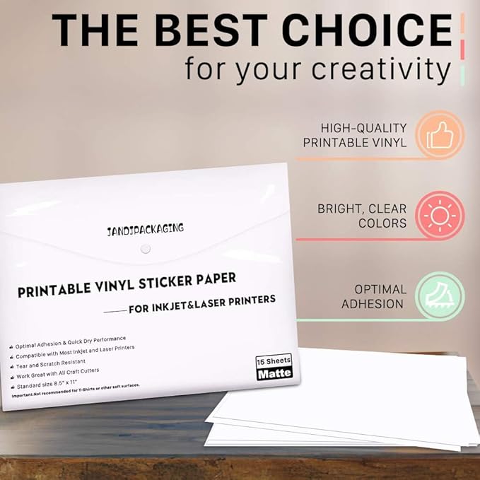 JANDJPACKAGING Printable Vinyl Sticker Paper - Waterproof Printable Vinyl for Laser & Inkjet Printer 15 Self-Adhesive Sheets - Matte White - Standard Letter Size 8.5"x11"