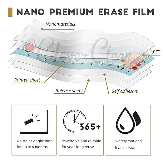 - NEW TECHNOLOGY, NEW EXPERIENCE - Customer's experience is very important to us, so we use the nano premium erase film on our products. Compared to the old PET film, the nano material will make your writings super easy to be wiped off even after you leave the writings on the goal sticker for a very long time.