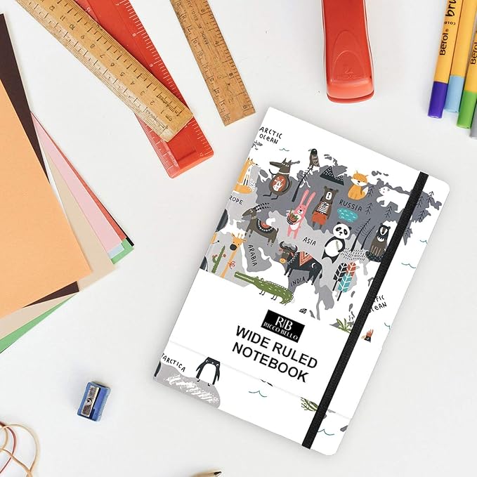 RICCO BELLO Wide Ruled Hardcover Diary Journal School Notebook for Kids, Tweens - Bookmark, Band Closure, Storage Pocket, 5.7 x 8.4 Inches, 192 Pages, (Animal World)