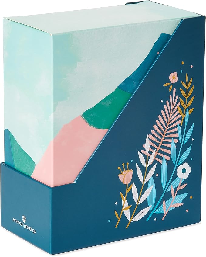 - The boxed cards assortment features contemporary art styles like watercolor brushstrokes, hand lettering, typesetting, letterpress, and shiny foil accents, adorned with vibrant imagery of birthday cakes, wedding decor, confetti, flowers, balloons, and icons, accompanied by heartfelt wishes.