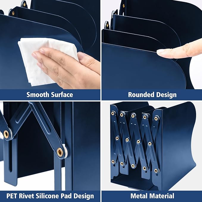 Adjustable Bookends, Heavy Duty Metal Book Ends for Book, 2 Dividers, Nonslip Book Stander for Desk, Shelf, Office, Stationery Gift, Extends up to 19 inches (Blue)