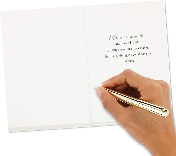 - Holiday cards feature a glittery photographic design of a cheery wreath dusted with snow. Inside reads: "Meaningful, memorable, merry and bright . . . wishing you a Christmas season that's everything you could hope for and more."
