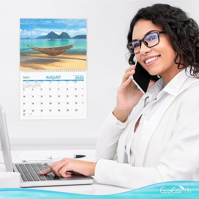 EcoEarth - Biodegradable 11x17 Inch (Open) 12-Month Vertical Hanging Wall Calendar - 2025 Monthly Calendar - Paradise Beaches
