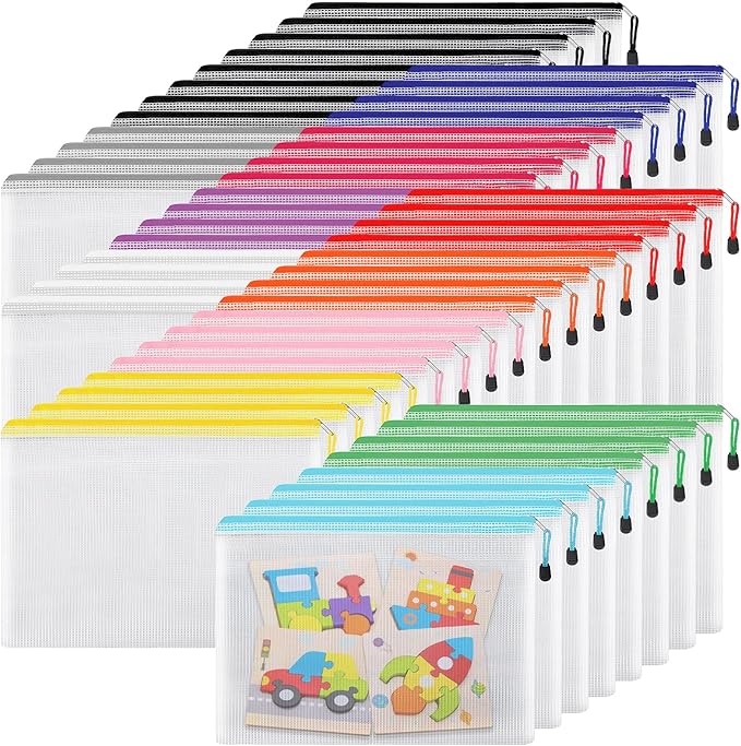 LABUK 52pcs Mesh Zipper Pouch Bags, A4 Letter Size Plastic Zipper Pouches, Waterproof Puzzle Toys Organizing Storage Bags for Classroom Organization, Board Game Storage