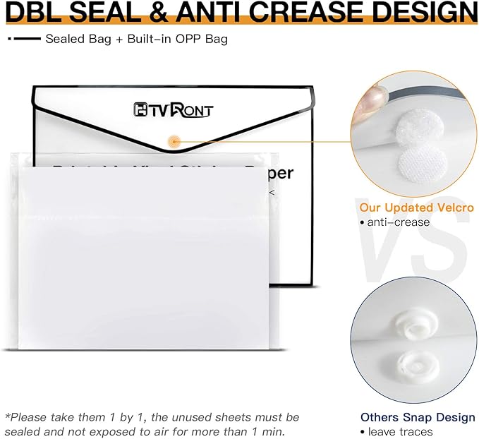 - LAY FLAT & ANTI CURLS DESIGN: Anti-curling and anti-printer jam design with double sealing protection: sealed bag + built-in OPP bag, making the inkjet printable vinyl sticker paper more flat. Designed to prevent indentation during transportation and use: updated Velcro instead of snap. Everything is to enhance your shopping experience, sincerely hope you like our printable vinyl for inkjet printer and share it with more friends