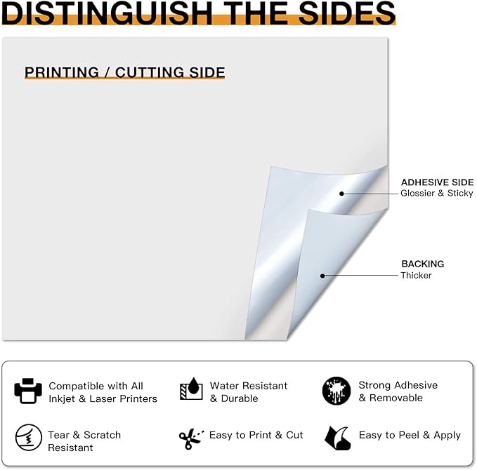 - HIGHLY DURABLE & SUITABLE THICKNESS: Our printable vinyl sticker paper has great stickiness, great for indoors & outdoors. Vinyl sticker paper has a special combined printing process, which can better integrate with ink and get longer life. With a suitable thickness, which can improve the recognition rate of the printer and reduce the jam rate, and make your decal better integrate with your project, reduce the friction on the design edge to achieve a longer adhesion life