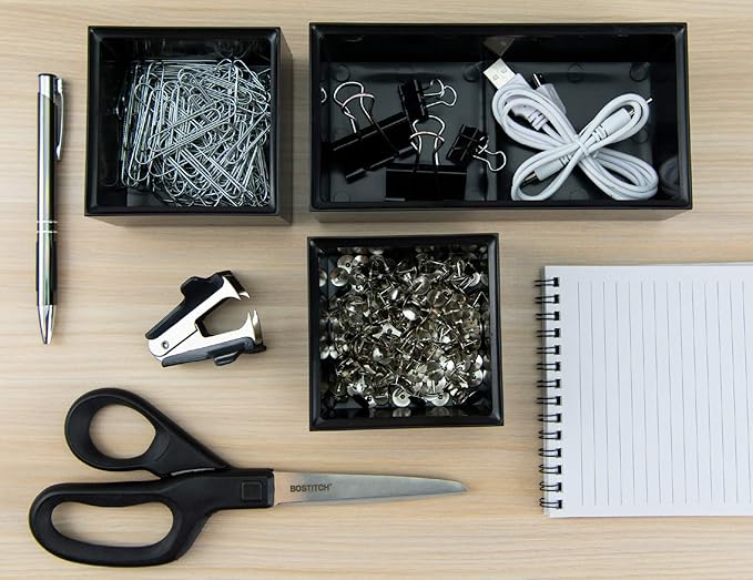 - Organizes stick notes, pens, paperclips, cords and other desktop essentials