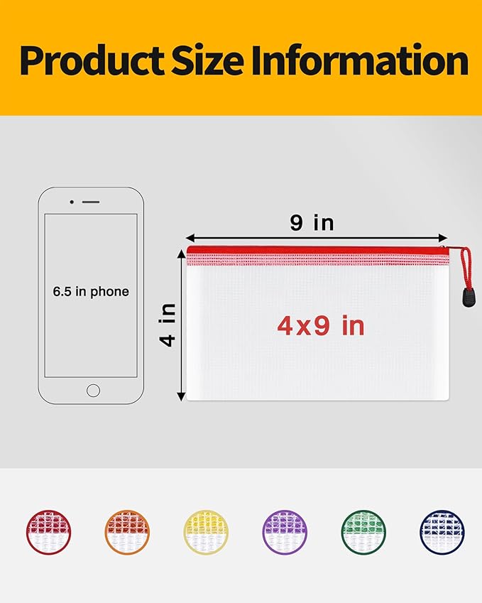 - PACKAGE CONTAINS: You will get a set of 12 Packs 4x9 inches multi-colored plastic zipper pouches for the most paper size of letter-size prints or smaller document storage. It can help you organize your miscellaneous items to meet your daily life and work. Manufacturer recommended age 3 years and up