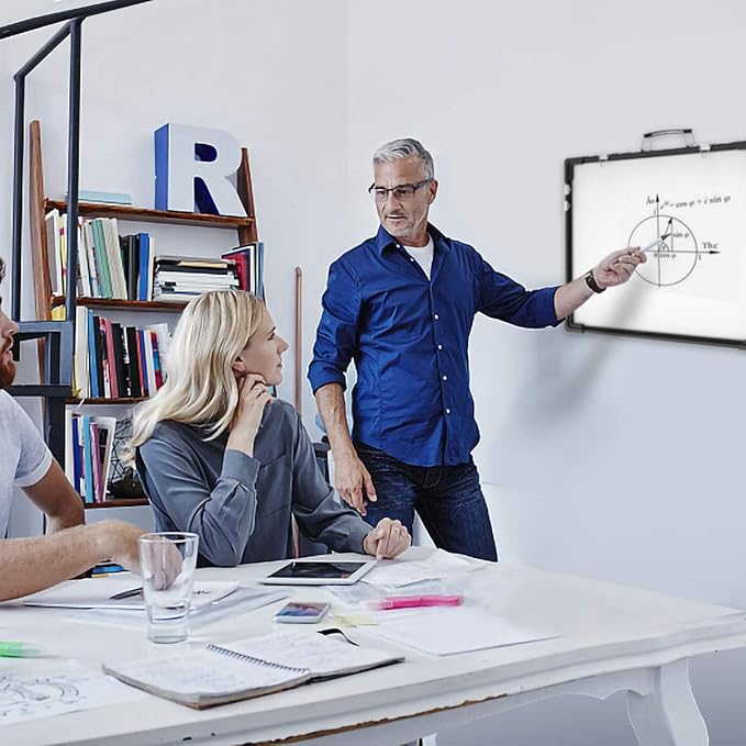 - [CUTTING-EDGE DESIGN] - Our whiteboard measures 24"x18" with a double-sided design. Our desktop size white board requires minimal space comfortably fit on your desk. The dry erase white boards provides an ample surface for capturing quick notes. The whiteboard also allow two people to use it due it's dual-design. The weight of the desktop whiteboard is 9.5lbs. The dry erase board has a handle at the top, making it portable. The dry erase boards can easily be stored or hung on wall.