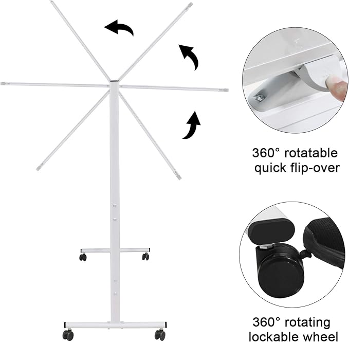 - [Easy Flip Double Sided Magnetic Dry Erase Board & Portable Standing Whiteboard]: Double sided mobile whiteboard have Quick Flip Over Reversible Feature, Flip the board to the other side with the press of a button. You have TWICE the writing space when you utilize BOTH sides of the portable whiteboard with stand, and the 2"(w) x 70.5"(L) pen tray can be placed with a lot of pens and erasers to facilitate your writing anytime and anywhere.