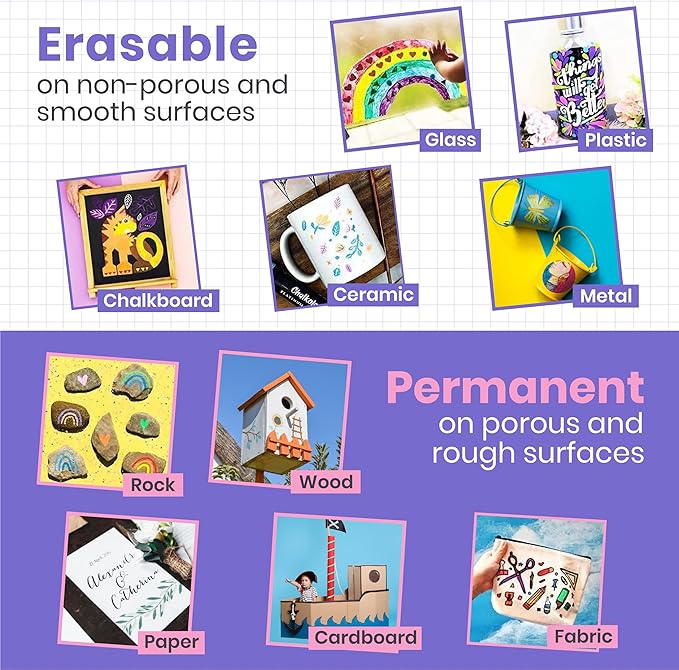 - Come off Easy - The chalkboard pen will work on almost any surface! Will erase off non-porous surfaces; such as blackboard (wet erase), glass & mirrors (dry erase) and Permanent on porous surfaces