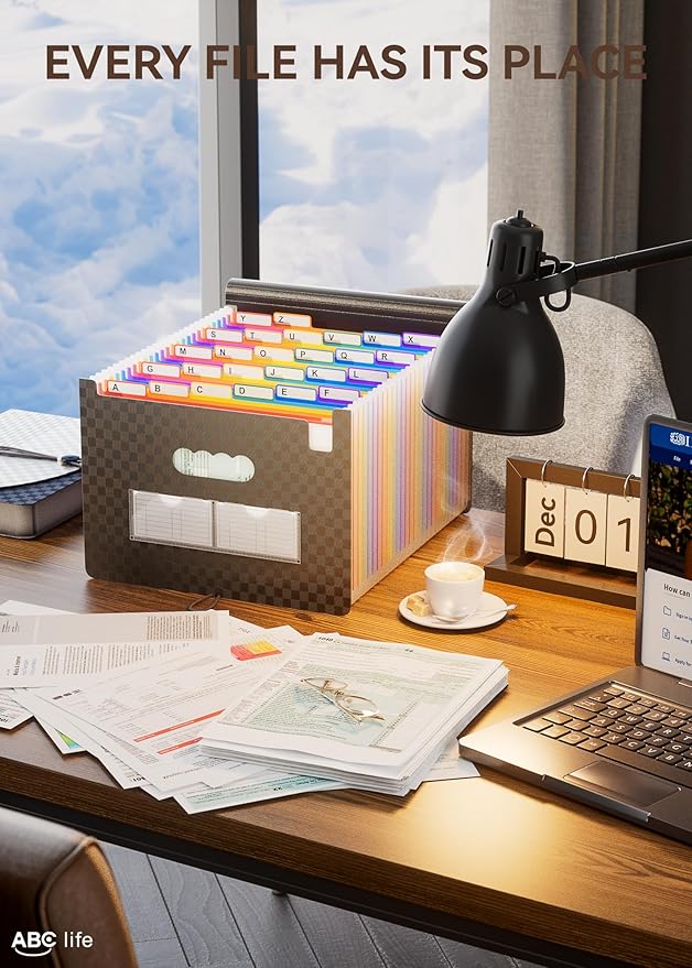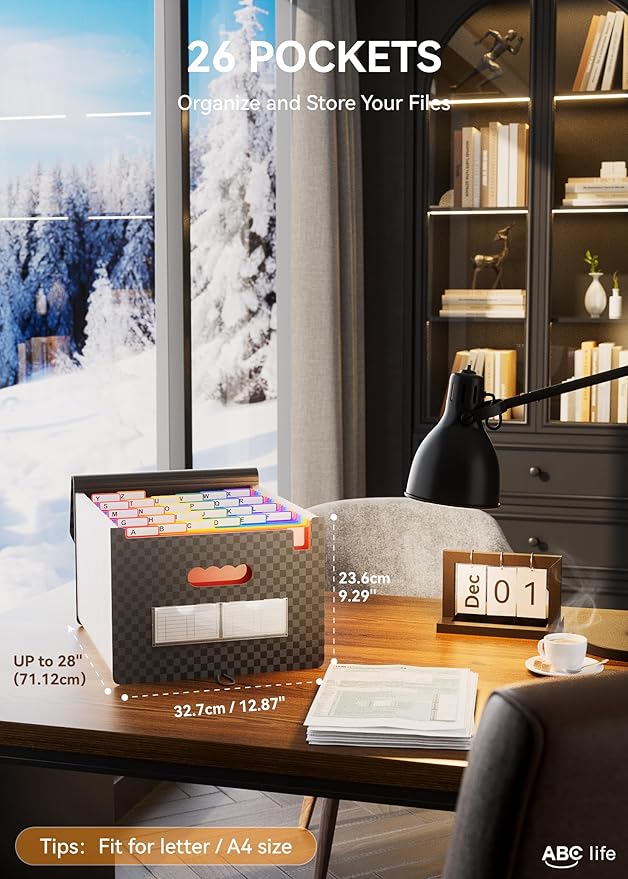 - ✅【26 POCKETS MONTHLY FILE ORGANIZER】ABC life 26 pockets Accordian File Organizer suitable for filing tax and storing important family documents. Product size is 13 "x 9.4"x 28", which can be used to store plenty of Letter/A4 size files.