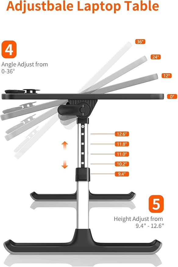 - Ergonomic Design Bed Desk - Soft wrist rest pad provides your wrist a comfortable place. The retractable blocker protects your computer from falling down. 5 adjustable heights(9.4"-12.6") and 4 adjustable angles (0-36°) provide you a more comfortable posture and avoid back & neck pain.