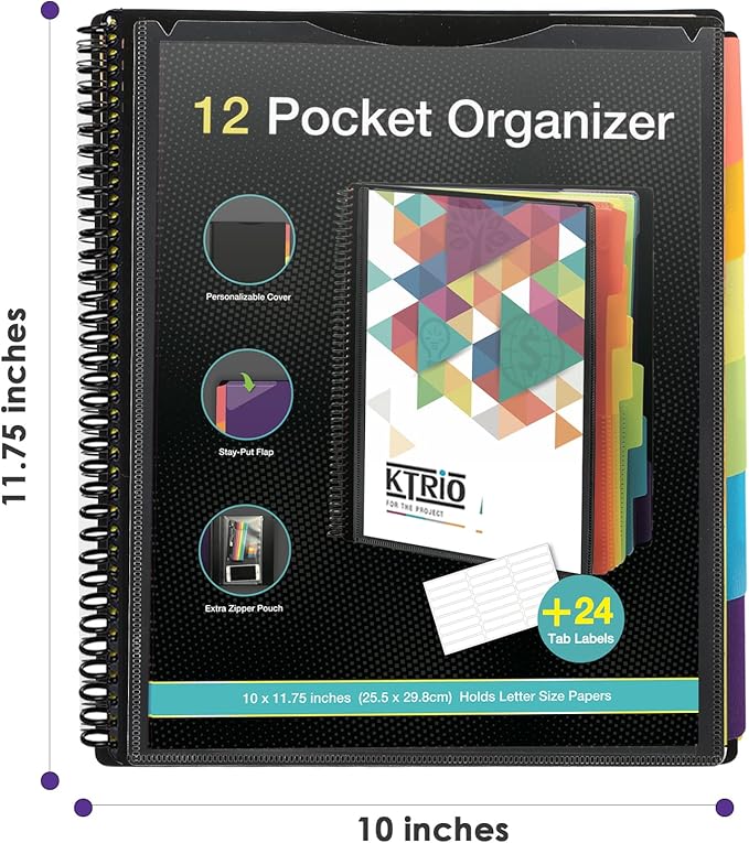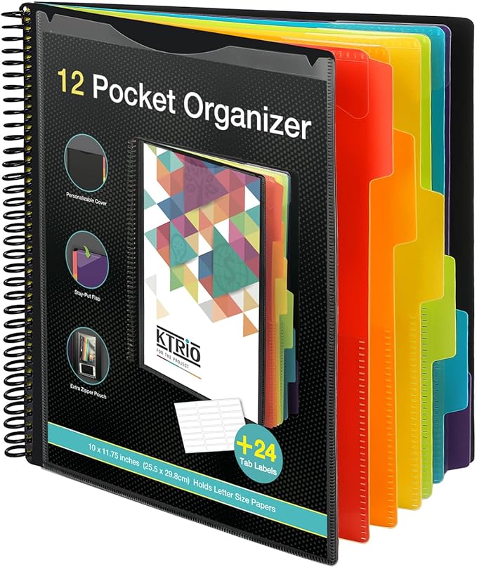 KTRIO 12 Pocket Poly Project Organizer, Spiral Binder Organizer Multi Pocket Folder with Dividers, Back Cover Utility Pouch, Letter Size School Supplies