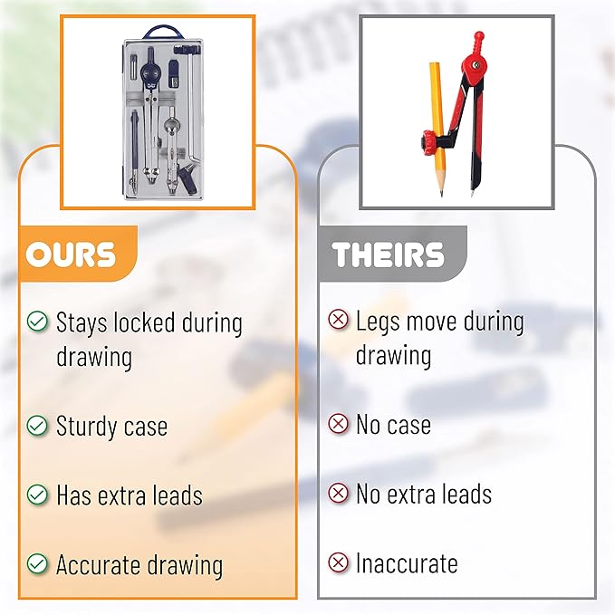 - Precision geometry compass with spring bowhead and center wheel prevents unintentional leg movements