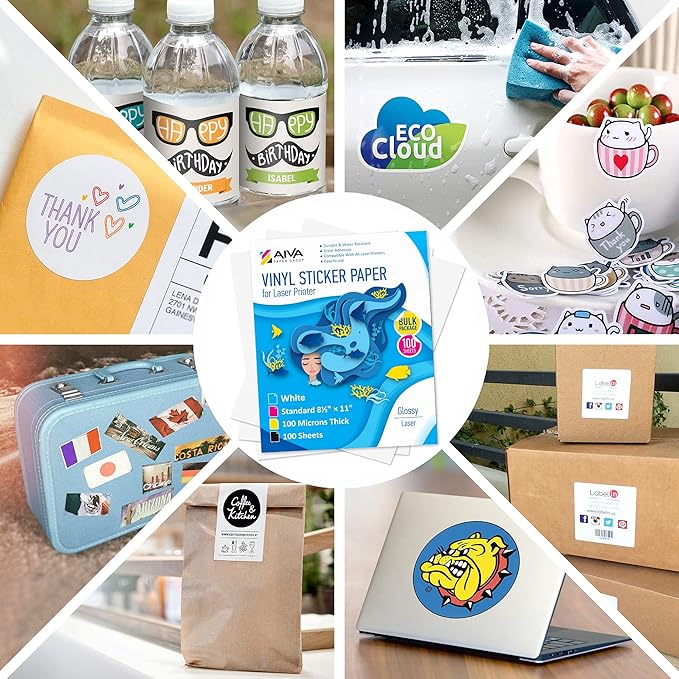 - Bulk Package of 100 sheets Printable Vinyl Sticker Paper for Laser printer - Glossy finish - 8.5"x11"