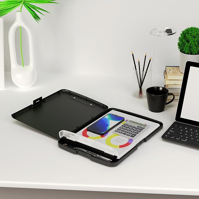 - High Capacity: Storage clipboard built-in a paper storage box and a pencil case, large enough to hold up 200 sheets of A4 paper and 6 pencils. Allows to store most daily office supplies and keep them organized