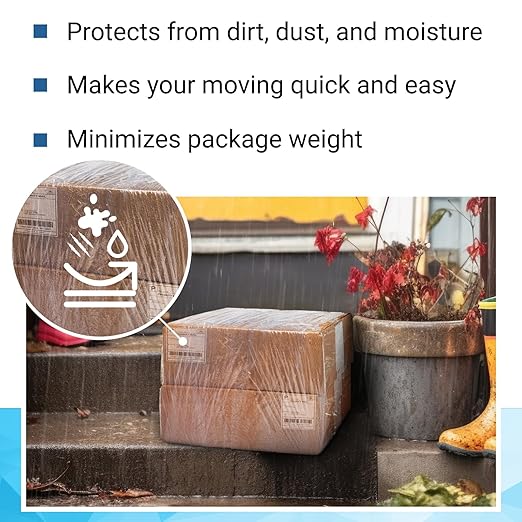 - PROTECTION FROM DIRT, DUST, AND MOISTURE: This stretch wrap roll clings to itself superlatively providing sealed cover that works as protection from dirt, dust, and moisture. This strong and durable stretch film shell keeps wrapped products from puncturing or tearing on sharp corners. Stretch plastic wrap works great for wrapping, shipping, and storing