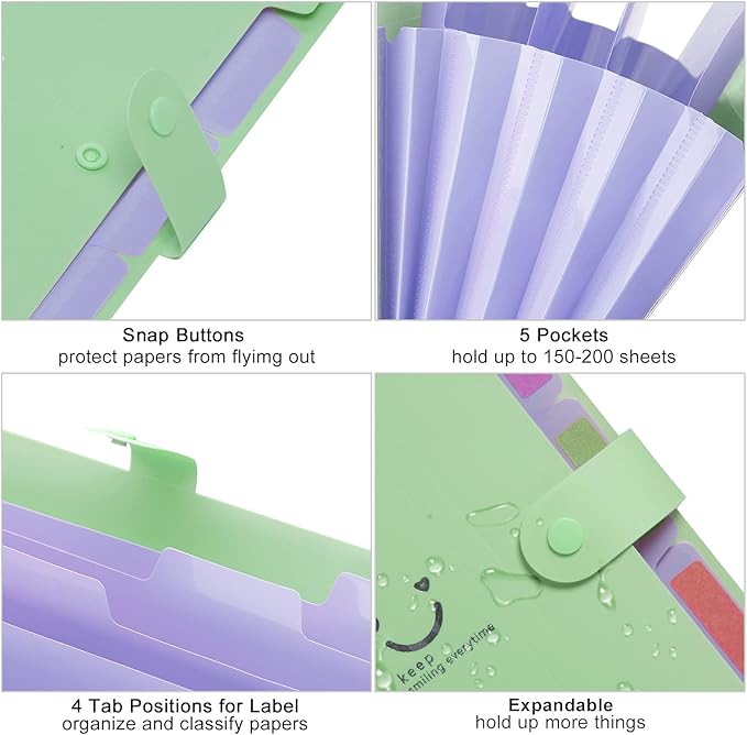 Forvencer Accordion File Organizer, Letter Size, 5 Pocket Expanding File Folder, Cute File Folder with Labels, Portable File Organizer for School Office Supplies, Folders for Documents, Green