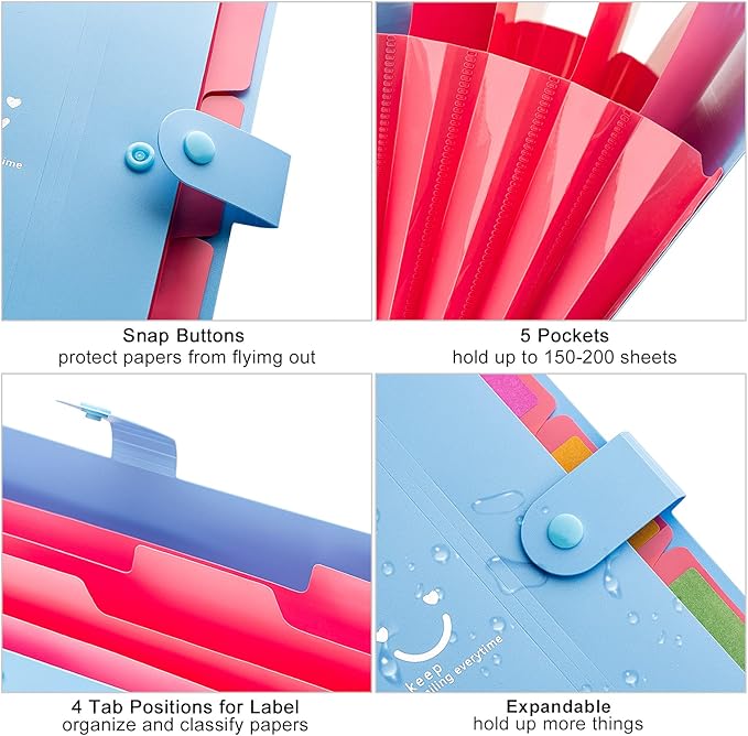 Forvencer Accordion File Organizer, Letter Size, 5 Pocket Expanding File Folder, Cute File Folder with Labels, Portable File Organizer for School Office Supplies, Folders for Documents, Blue