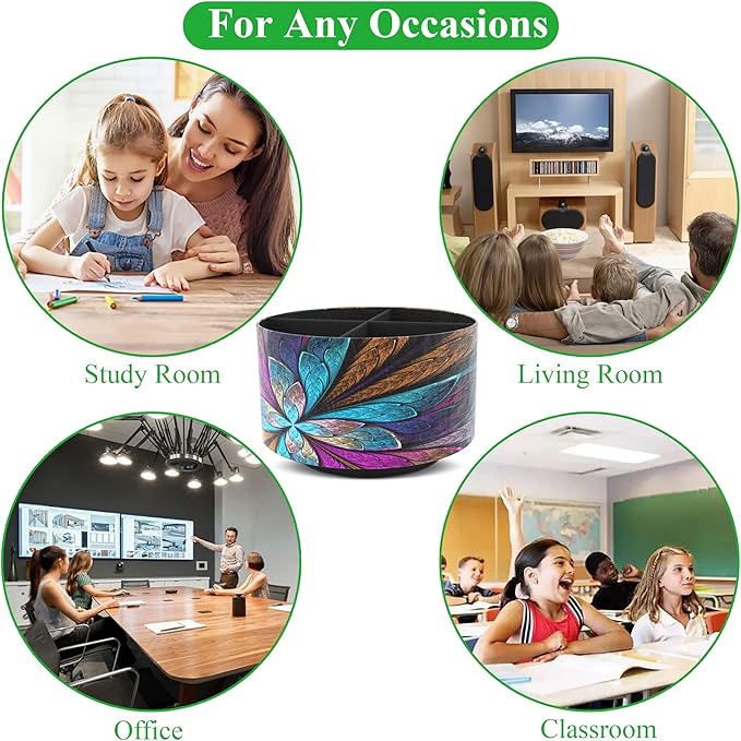 Hennaja Round Leather Art Supply Organizer,Remote Control Holder,360 Degree Rotating,Multi-Functional Pencil Holder,4 Compartments Desktop Stationary Organizer(1-Fractal Flower)