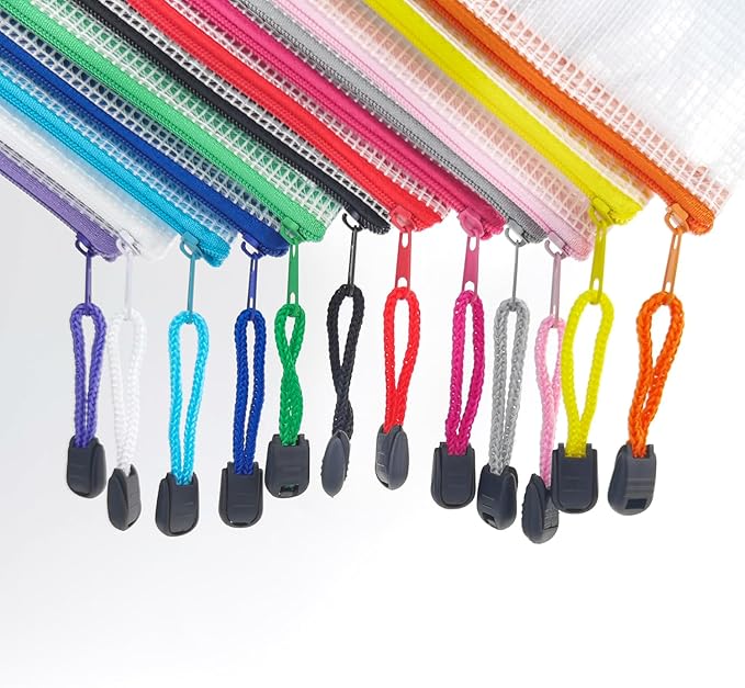 - 12Pcs Mesh zipper bags with label pocket, A5 size 9.2x6.7 inch. Widely used in Office Home Hospital and Travel. Great zipper file bags, board game storage bags, pencils pouches, puzzles bags, cross stitch projects bags or keeping various craft projects organized. These mesh bags could meet your needs in all ways