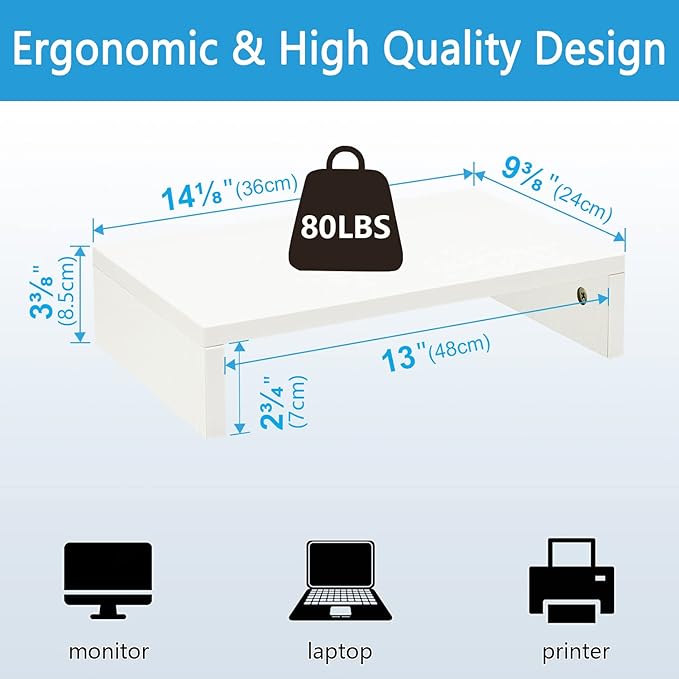 TEAMIX 14.2 inch White Monitor Stand Riser, Wood Monitor Riser with Storage for Desk Small Monitor Stand TV/Screen/PC/Laptop Riser Computer Stand Desktop Shelf (White-14.2 inch)