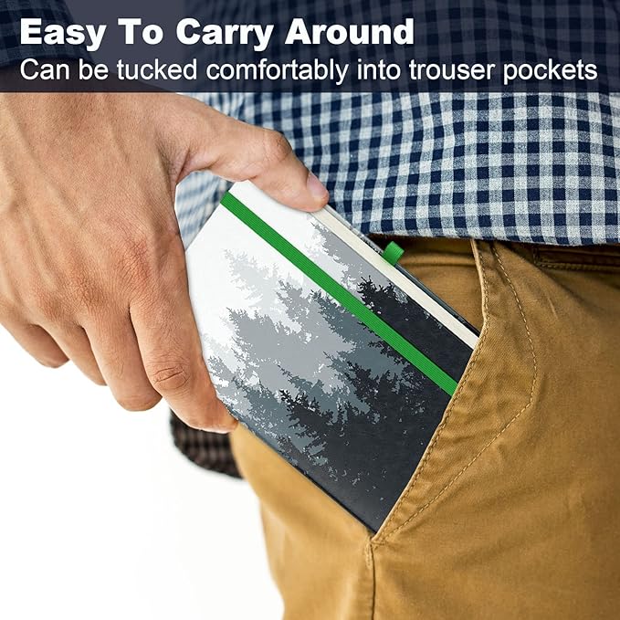 - Pocket Hardcover Notebook: The cute A6 mini notebooks measures 3.9x5.7inch. Fits in back pocket, shirt pocket or purse well. Includes 160 pages ivory thick paper, 1 ribbon bookmark, 1 inner pocket, 1 Pen Holder loop and 1 elastic closure band