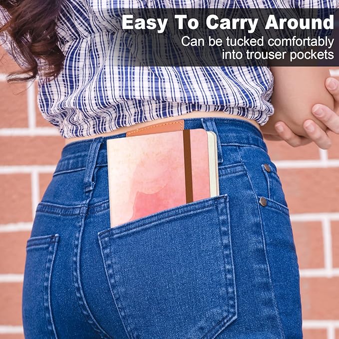 - Pocket Hardcover Notebook: The cute A6 mini notebooks measures 3.9x5.7inch. Fits in back pocket, shirt pocket or purse well. Includes 160 pages ivory thick paper, 1 ribbon bookmark, 1 inner pocket, 1 Pen Holder loop and 1 elastic closure band