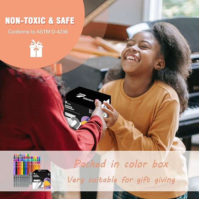 TOWON Permanent Markers 72 Assorted Colors - Waterproof Colored Pens Set 45 Fine Tip, 8 Ultra Fine, 8 Chisel Tip, 6 Neon, 5 Metallic Markers Home Office School Supplies for Kids, Adults Coloring