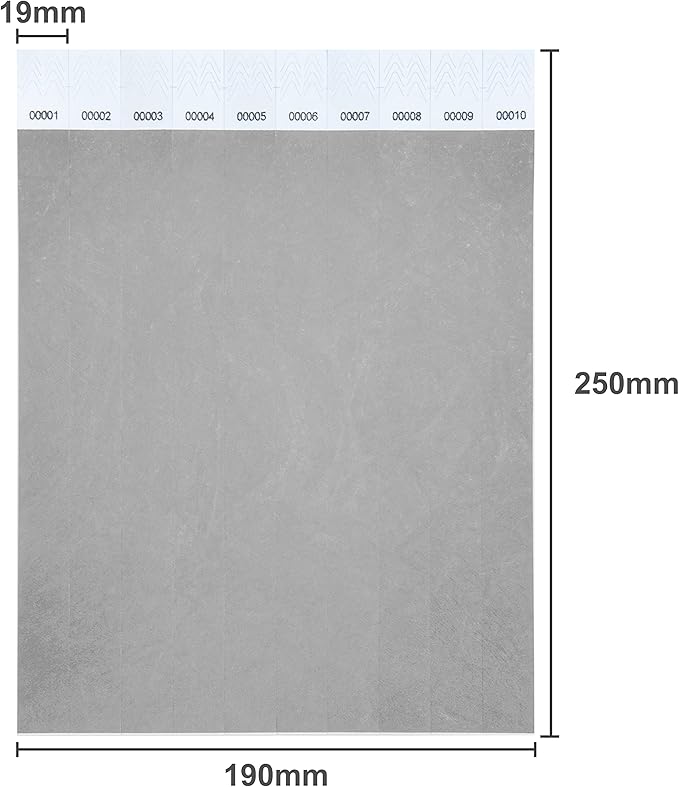 - Silver wristbands are10" long and 3/4" wide. A piece of paper is 10 wrist straps. 100 wristbands have 1-100 consecutive numbers.