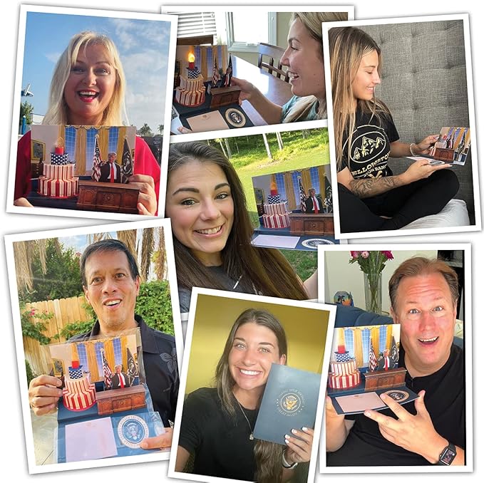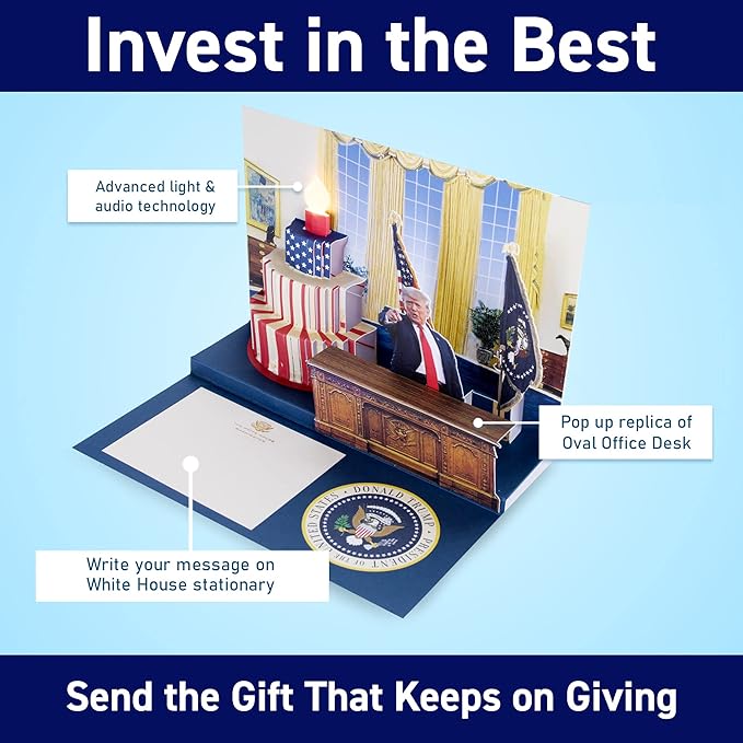 - Enter President Trump's Oval Office - When you open this fantastic talking celebration card, you’ll be magically transported into the presidential Oval Office. From the popup wood desk to the flags proudly displayed in the background—even the paintings on the wall—you’ll feel like you’re right there, talking to the Commander in Chief himself. You can even write a custom message on White House stationary for your loved ones with the Presidential seal of approval!