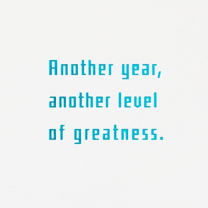 - Front features a video game controller with white lettering on a black foil background. Message reads: "Happy Birthday." Inside reads: "Another year, another level of greatness."